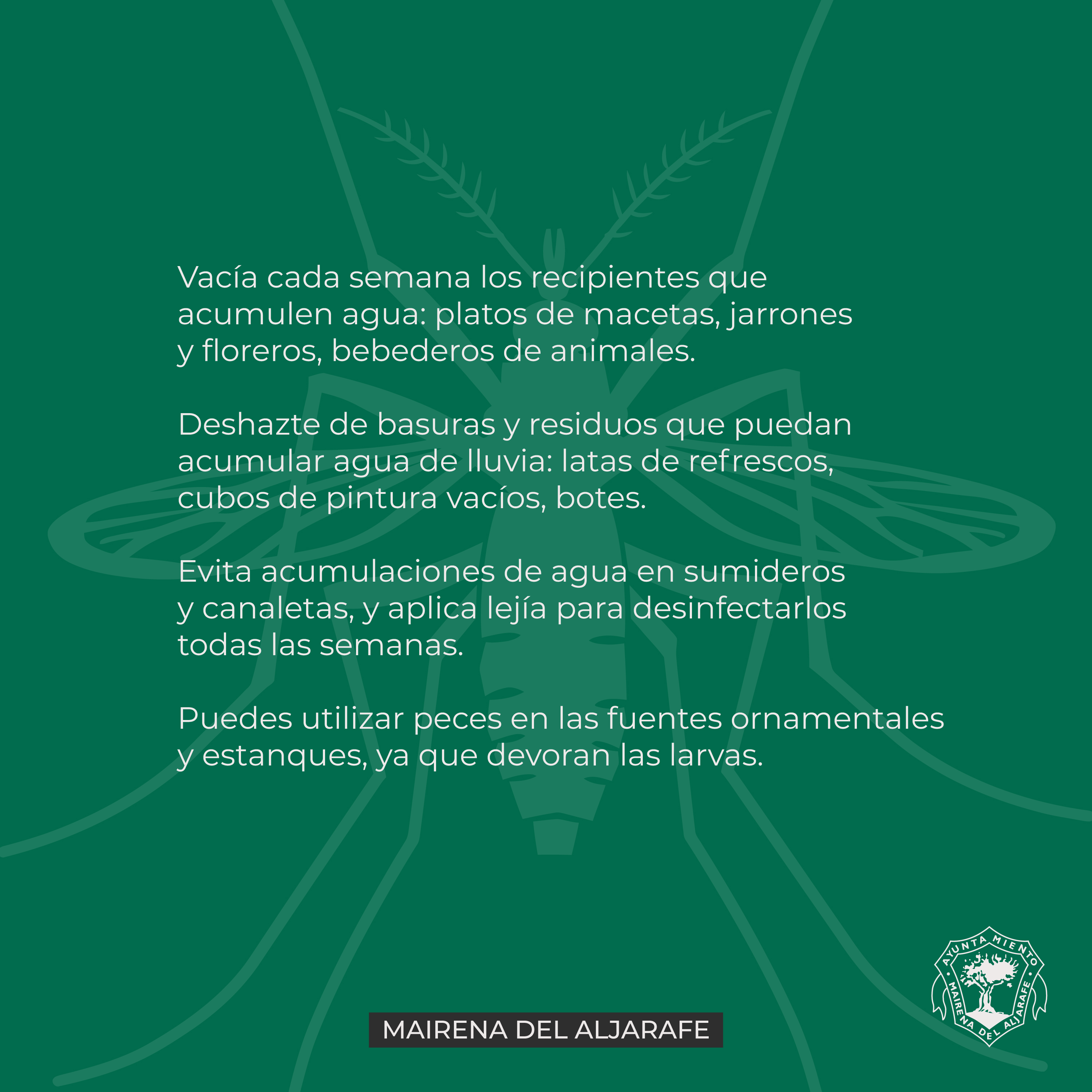 Tras la confirmación de un caso de Fiebre del Nilo Occidental en Mairena del Aljarafe, el Ayuntamiento hace un llamamiento a la ciudadanía para reforzar las medidas de prevención contra los mosquitos, principales transmisores de esta enfermedad.