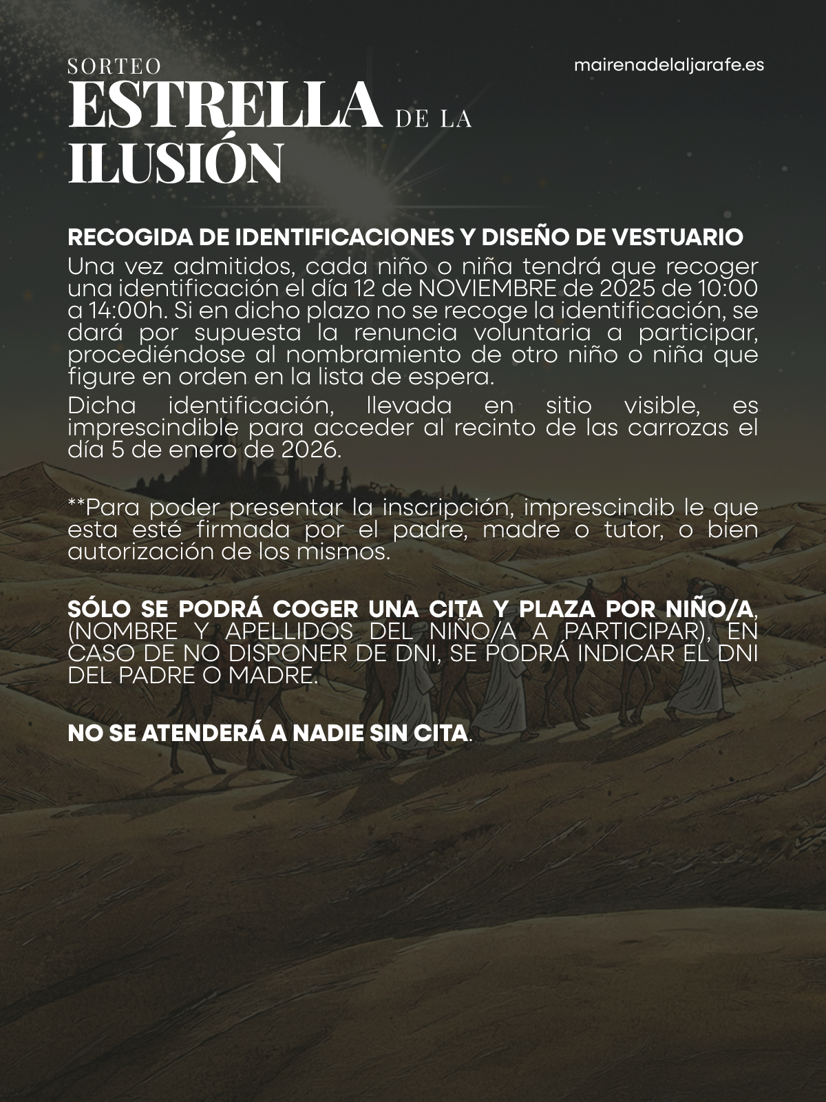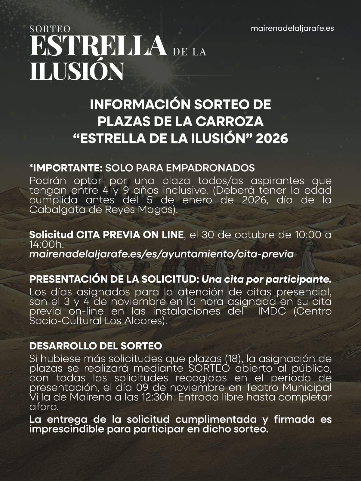 ✨ ¡La magia de la Cabalgata de Reyes está cada vez más cerca! 🌟 Sorteamos plazas para que niños y niñas de Mairena (de 4 a 9 años) puedan subirse a la carroza de la Estrella de la Ilusión el próximo 5 de enero. 🎠 Para participar, pide cita previa el 30 de octubre (de 10:00 a 14:00h) en la plataforma del Ayuntamiento. Consulta el protocolo y sigue las instrucciones paso a paso. 📄 Inscríbete los días 3 y 4 de noviembre en las oficinas del IMDC (Centro Sociocultural Los Alcores). Entrega la solicitud firmada por madre, padre o tutor. 🎉 El sorteo se celebrará el domingo, 9 de noviembre, a las 12:30h en el Teatro Municipal, con entrada libre hasta completar aforo. 👑 ¡No pierdas la oportunidad de vivir uno de los momentos más especiales de nuestras fiestas y forma parte de la Estrella de la Ilusión! #CabalgataMairena26 #NavidadenMairena #Mairenismo