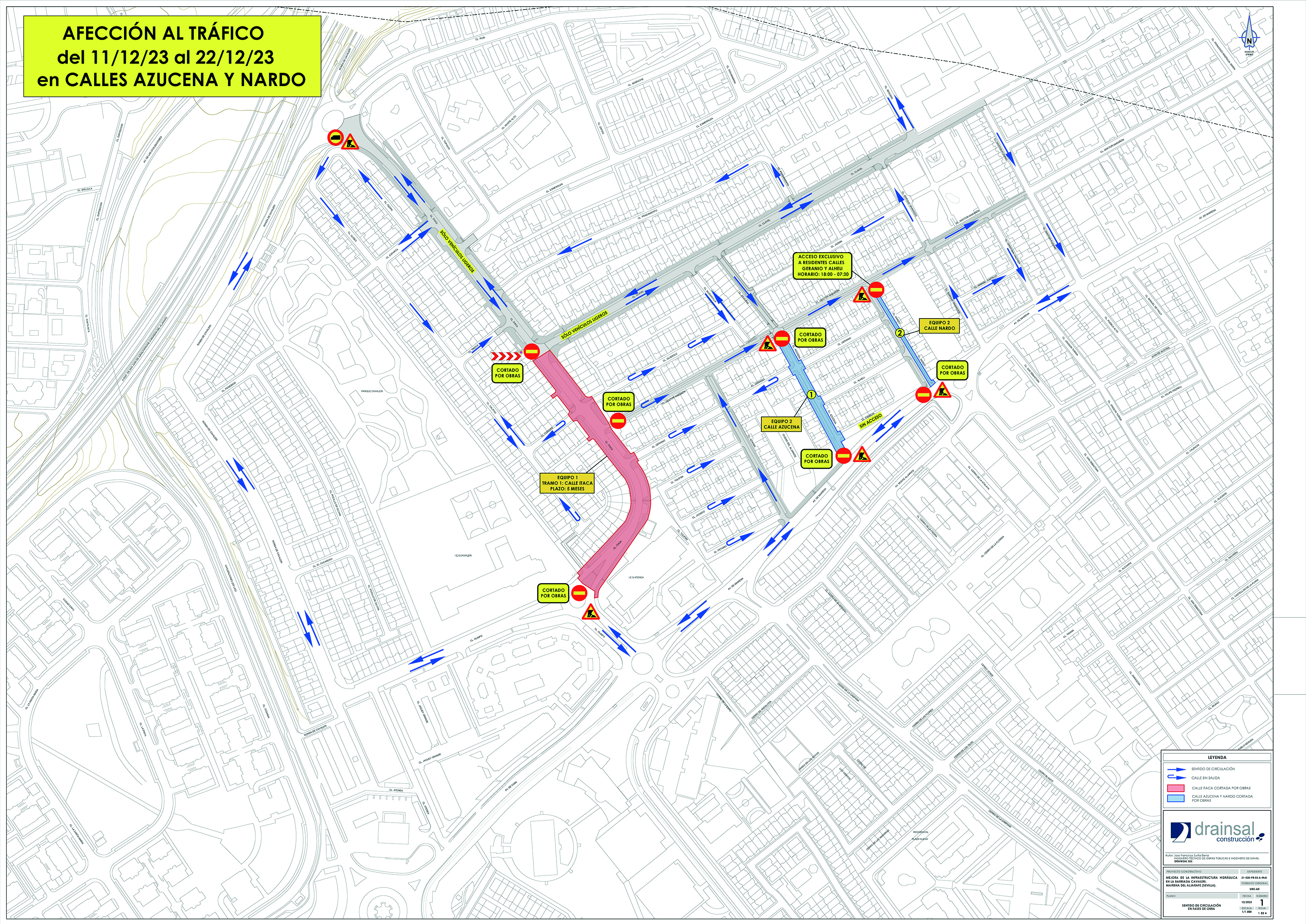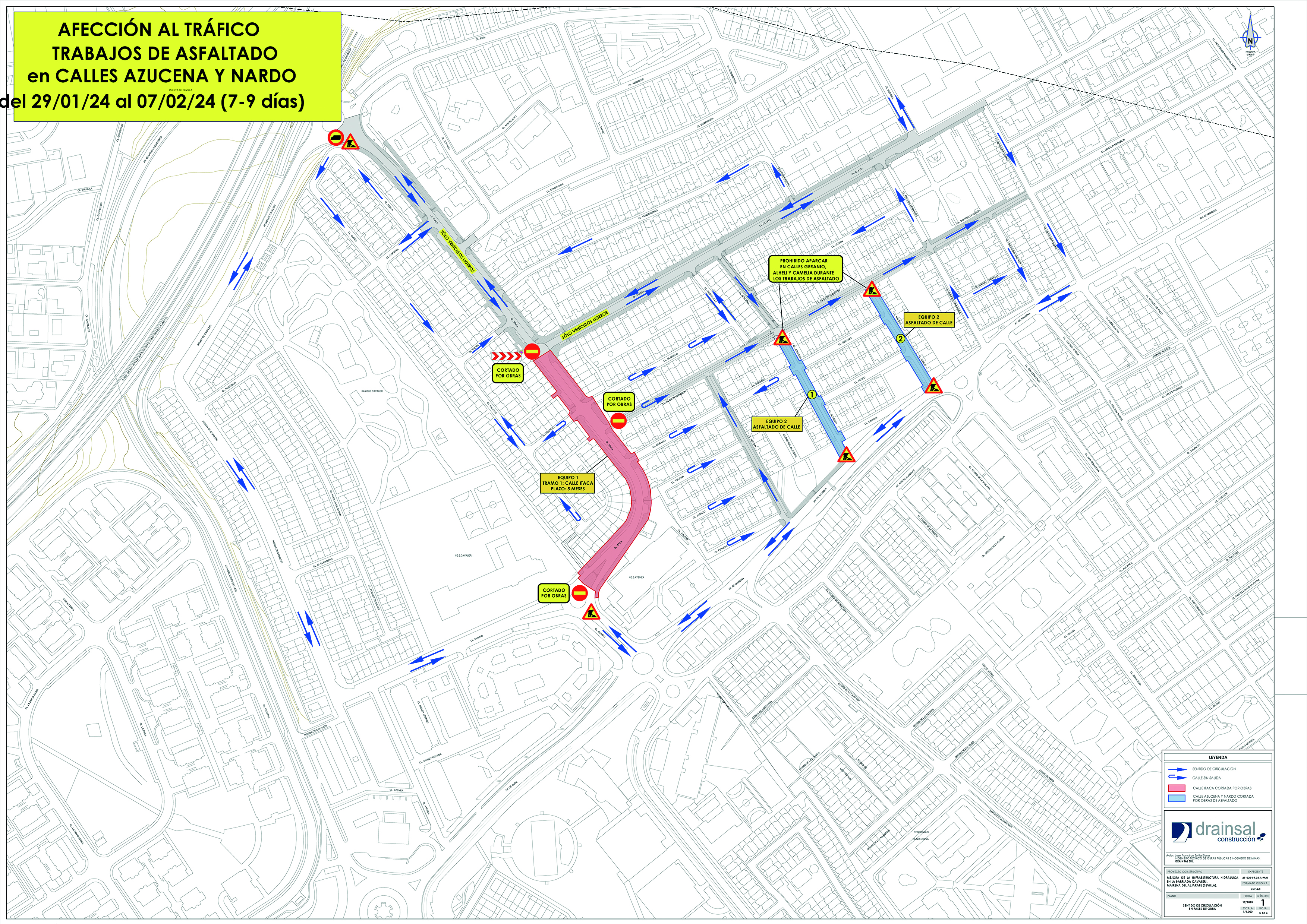 Se inician obras de demolición para apertura de zanjas de red abastecimiento en la acera este de la calle Nardo. La calle Nardo queda parcialmente cortada al tráfico y con prohibición total de aparcar, dejando una calzada de único sentido de acceso solo a residentes en calles Nardo-Geranio-Alhelí. Para situaciones de emergencia se prevé la disponibilidad de la calzada central de la calle, que dejara libre en situaciones singulares el equipo de obra.