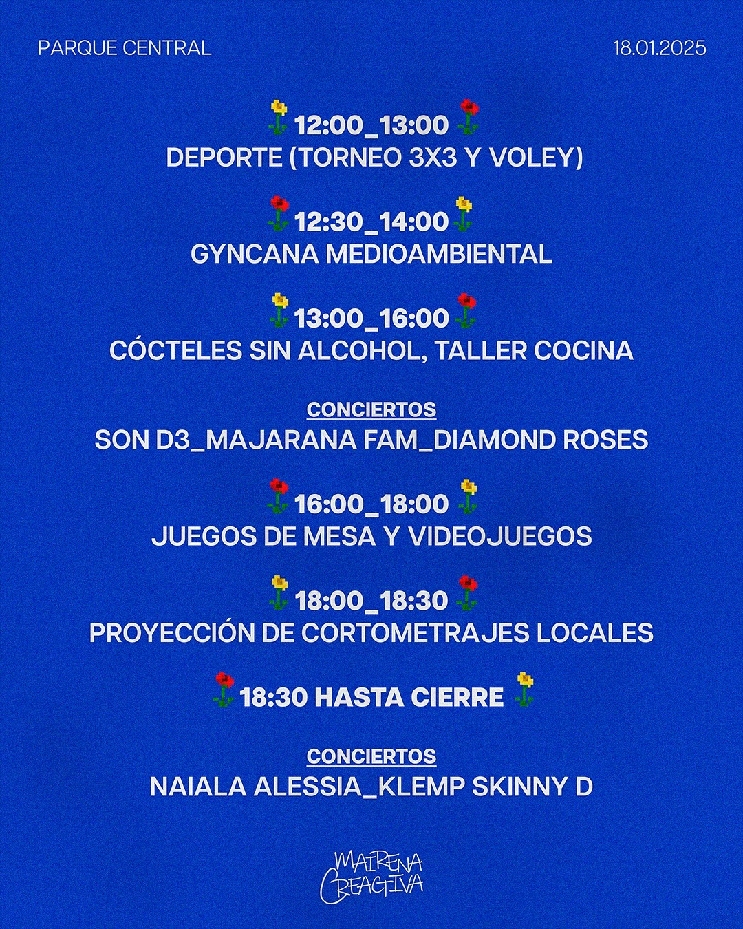 La programación incluye torneos de baloncesto y voleibol, talleres de cocina, juegos de mesa, videojuegos y una proyección de cortometrajes locales. Desde las 13:00 horas, artistas como Son D3, Majarana Fam y Diamond Roses animarán la jornada, mientras que Naiala Alessia, Klemp y Skinny D cerrarán el evento con su energía y talento.