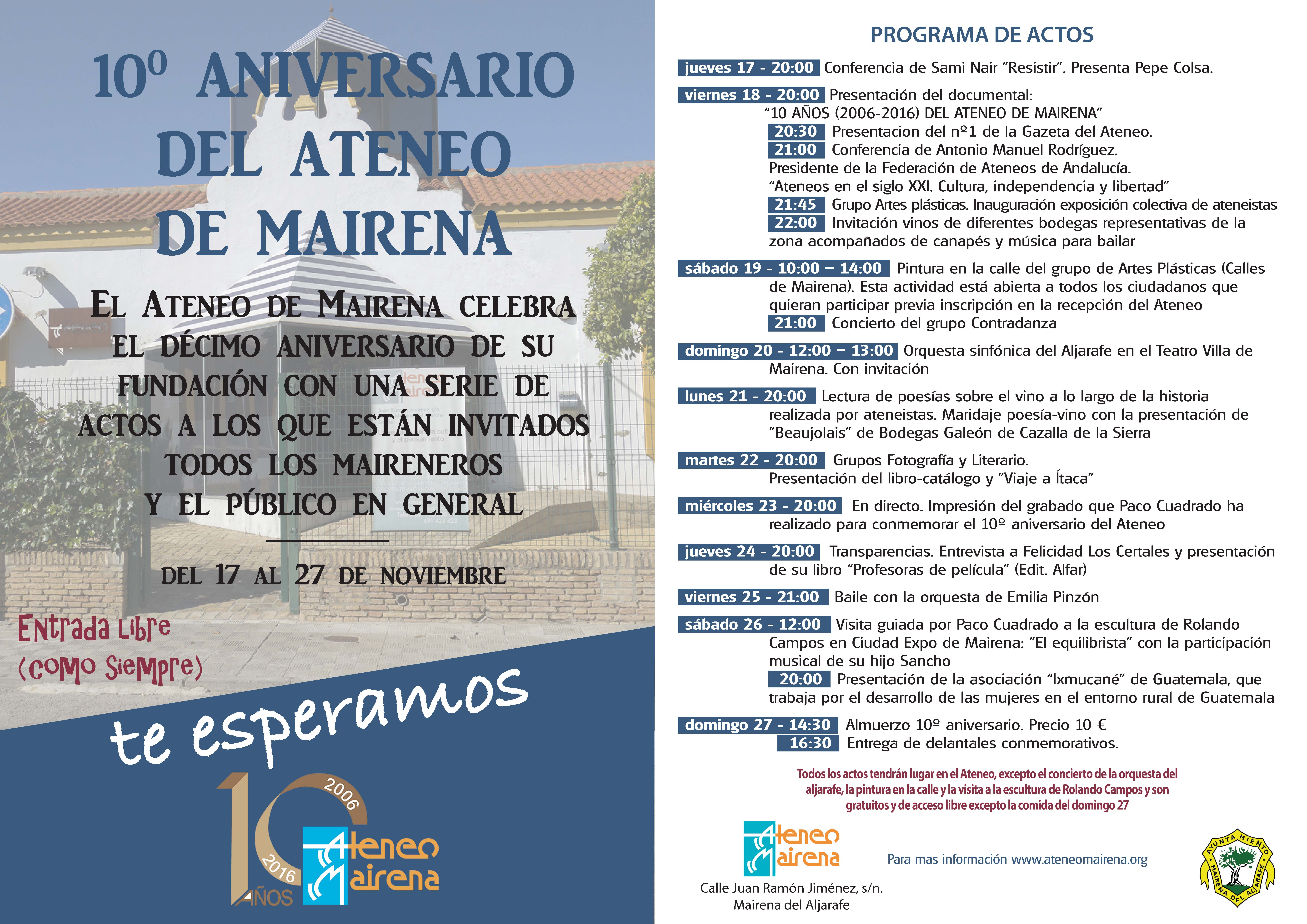10:00 - 14:00 Pintura en la calle del grupo de Artes Plásticas (Calles de Mairena). Esta actividad está abierta a todos los ciudadanos que quieran participan previa inscripción en la recepción del Ateneo.