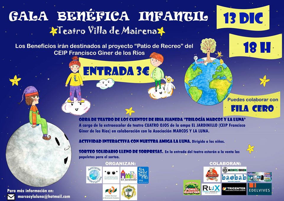 Precio de la entrada: 3 euros. Recaudación con fines benéficos para proyecto "Patio de Recreo" de CEIP Fco. Giner de los Rios