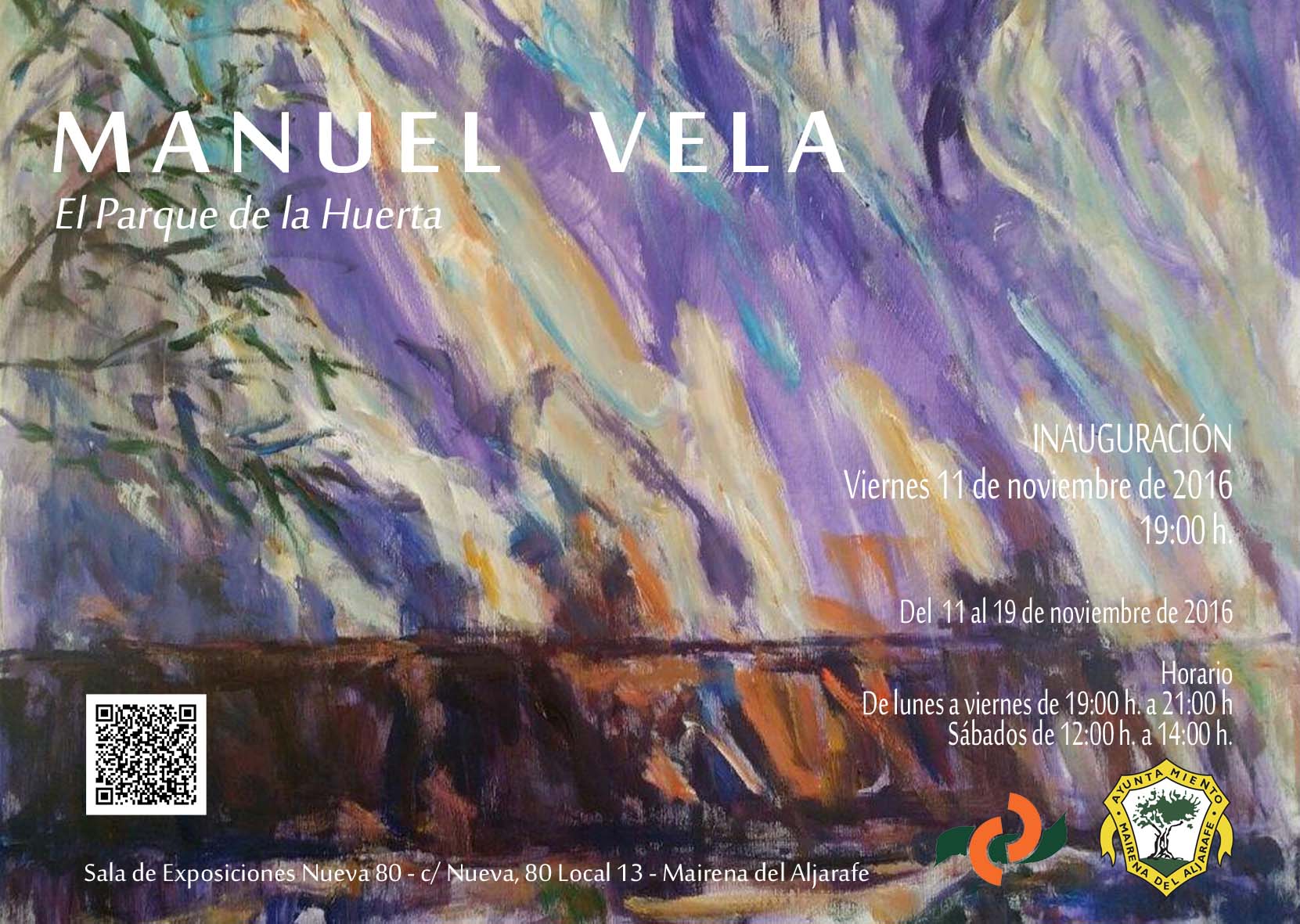 en la Sala de Exposiciones Municipal, ubicado en el número 80 de la Calle Nueva, se inaugura a las 19:00 horas la exposición de Manuel Vela, en la que hace una muestra pictórica del Parque de la Huerta. La exposición estará abierta desde el viernes 11 de noviembre hasta el próximo sábado 21de noviembre.