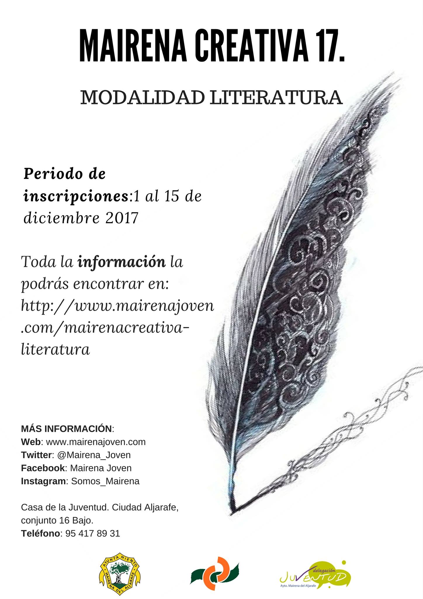 Los jóvenes entre 14 y 30 años que quieran demostrar toda la riqueza literaria que poseen tienen hasta el próximo viernes, 15 de diciembre, para inscribirse en el concurso. Para ello deberán enviar sus relatos cortos o poemas mediante correo electrónico a mairena.creativa@mairenadelaljarafe.org ateniéndose a los siguientes requisitos: los poemas tendrán una extensión máxima de 50 versos y se presentarán en Arial, fuente 12 e interlineado 1,5 mm; los relatos tendrán que seguir las mismas pautas y su extensión no podrá sobrepasar los cinco folios. Como identificación no hay que poner el nombre del autor o la autora, ya que con titular la obra será suficiente.