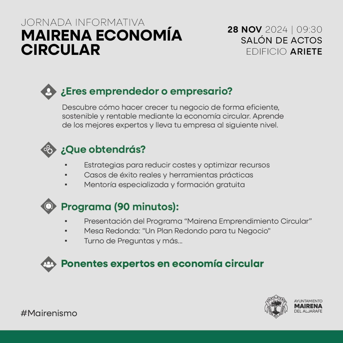 Puedes tener más información y formalizar tu inscripción en: emprendimiento@mairenadelaljarafe.org / 954 34 83 33